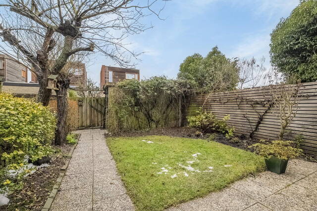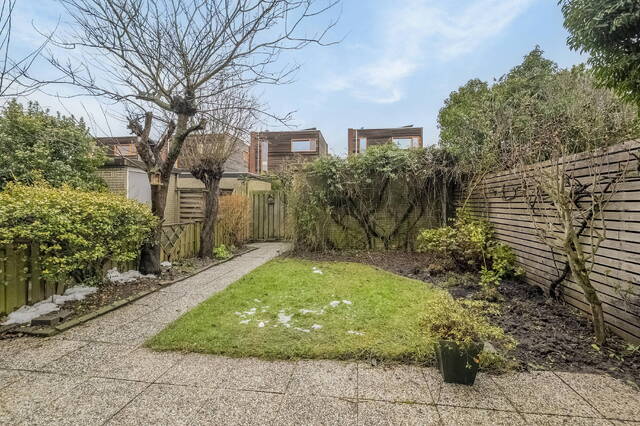 De achtertuin ligt op het westen. In deze tuin kunt u heerlijk genieten van de middag- en avondzon. De achtertuin is voorzien van achterom, bestrating, beplanting, een buitenkraan, handmatig bedienbaar zonnescherm en een ruime berging.