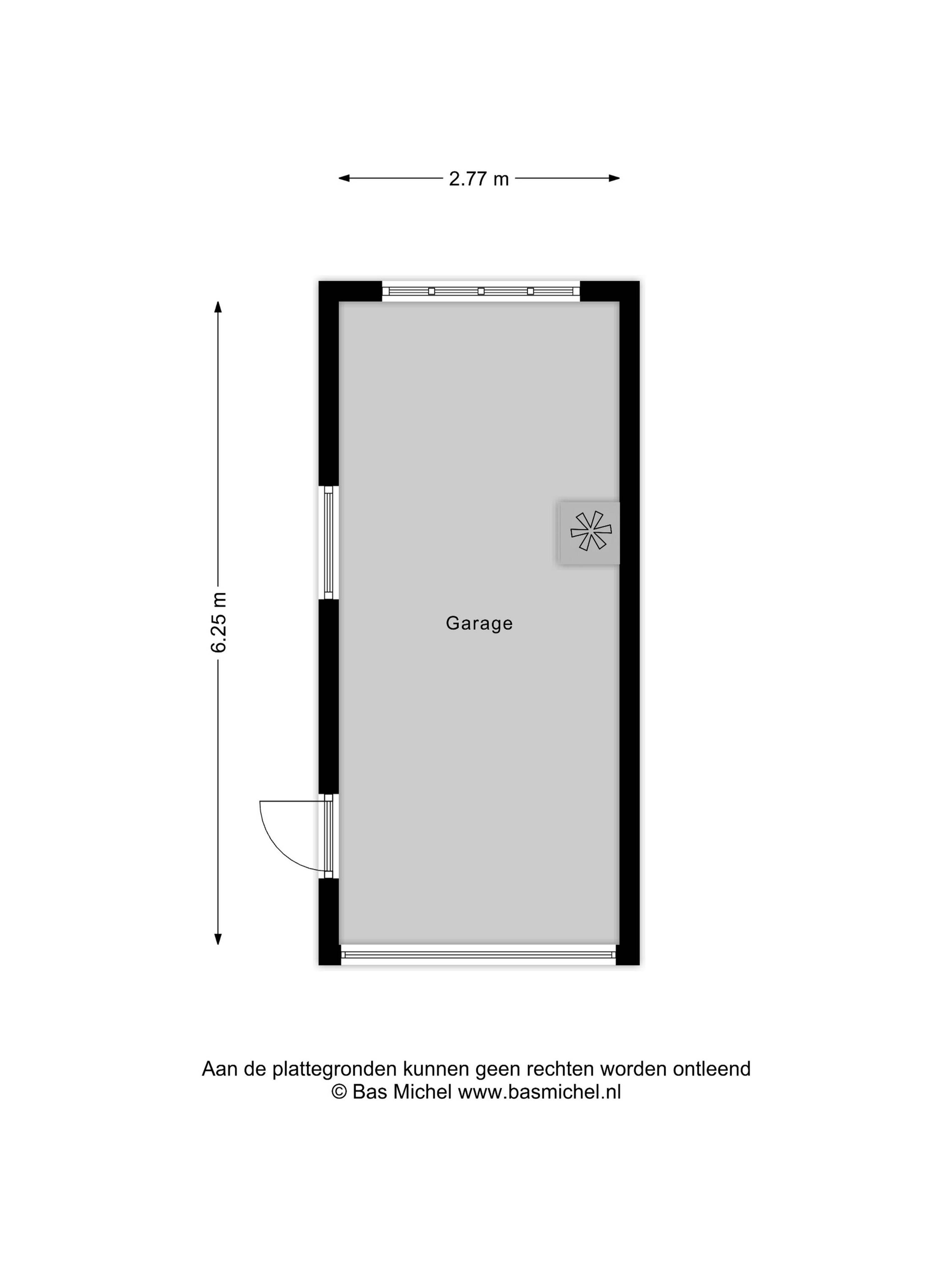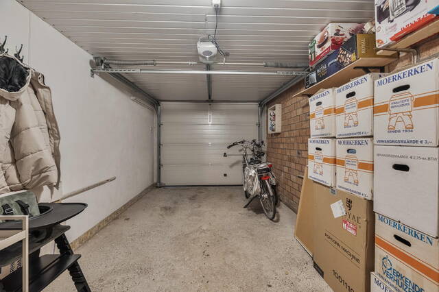 Inpandige garage (ca. 16 m2) voorzien van betonvloer, een elektrisch bedienbare garagedeur met afstandsbediening, afzuigsysteem en stopcontacten.