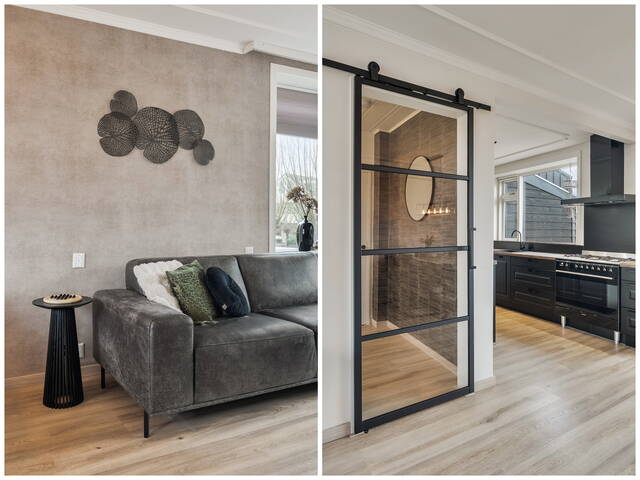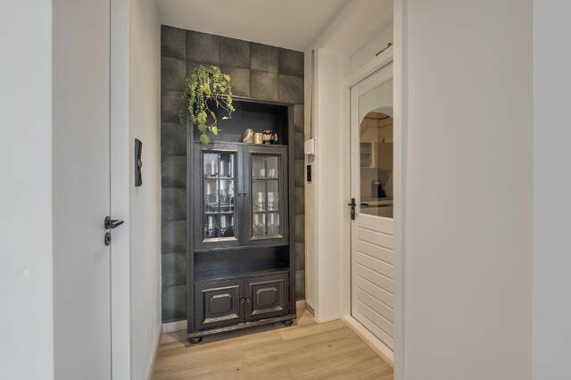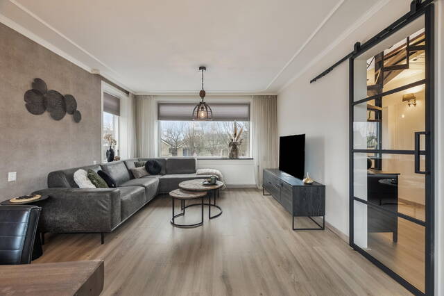 Het lichte doorzon woongedeelte (ca. 32 m2) wordt gekenmerkt door grote raampartijen aan de voor-, achter- én zijkant, wat zorgt voor een aangename lichtinval gedurende de hele dag. De woonkamer biedt verder voldoende ruimte voor het creëren van een eetgedeelte naast de woonkeuken. De ruimte is afgewerkt met een brede laminaatvloer, strak gestucte wanden en plafond.