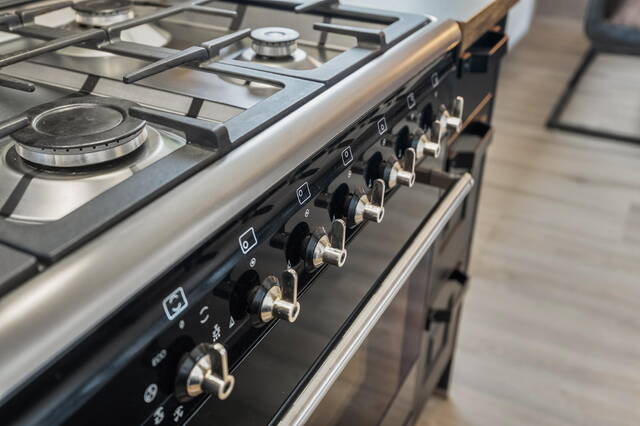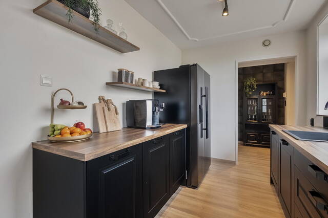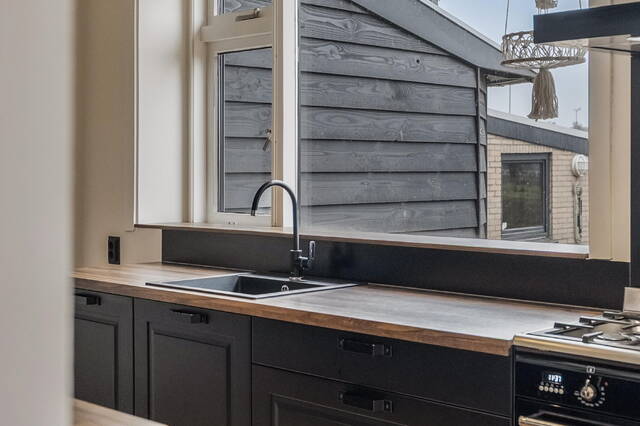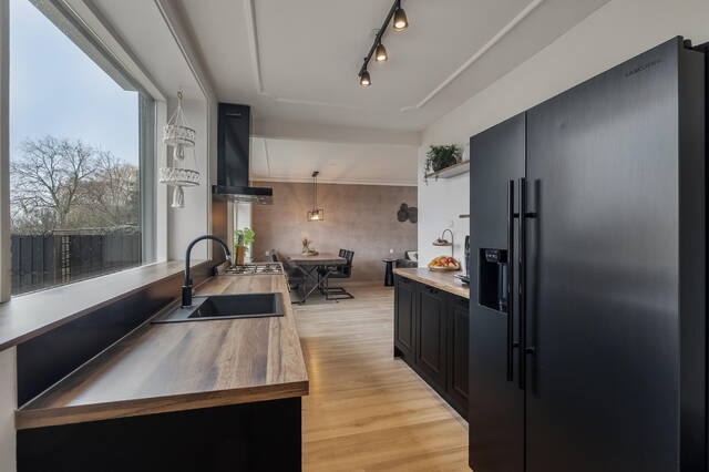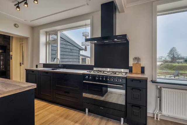 De woonkeuken is gelegen aan de achterzijde van de woning en is compleet uitgevoerd met een Amerikaanse koelkast van het merk Samsung, een Smeg 6-pits fornuis met oven, een bijpassende Smeg afzuigkap, een vaatwasmachine en een zwarte spoelbak. De keuken is verder uitgevoerd in twee rechte opstellingen, afgewerkt met kunststof aanrechtbladen met houtlook. Dankzij de grote raampartij in de keuken is er een prachtig uitzicht op de royale achtertuin. Via de keuken is de binnenhal naar de bijkeuken en de badkamer 1. De ramen aan de achtergevel op de begane grond zijn voorzien van elektrisch bedienbare rolluiken.