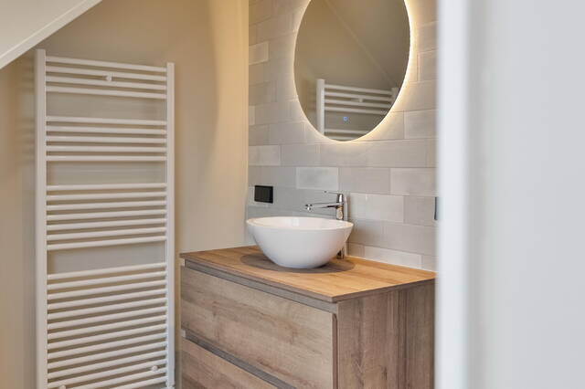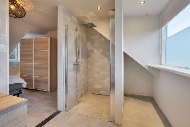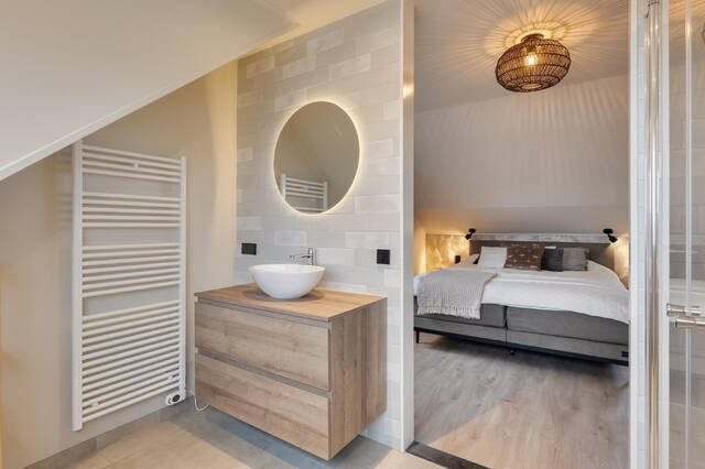 De badkamer en suite biedt alle voorzieningen voor comfortabel gebruik. De ruimte is uitgerust met een inloopdouche met openslaande glazen deuren en regendouche, een grote wastafel met wastafelmeubel, spiegel met verwarming en verlichting, en een elektrische handdoek designradiator. De wanden en vloer zijn gedeeltelijk betegeld. Tevens is de badkamer voorzien van afzuigsysteem.