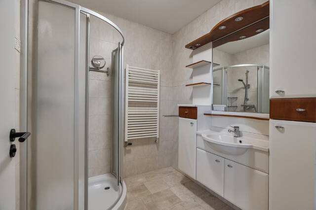 De badkamer 1 (ca. 4 m2) is uitgerust met een douchecabine, een wastafel met wastafelmeubel, een handdoekkast en een designradiator. De wanden en vloer zijn volledig betegeld in een beige kleurstelling.