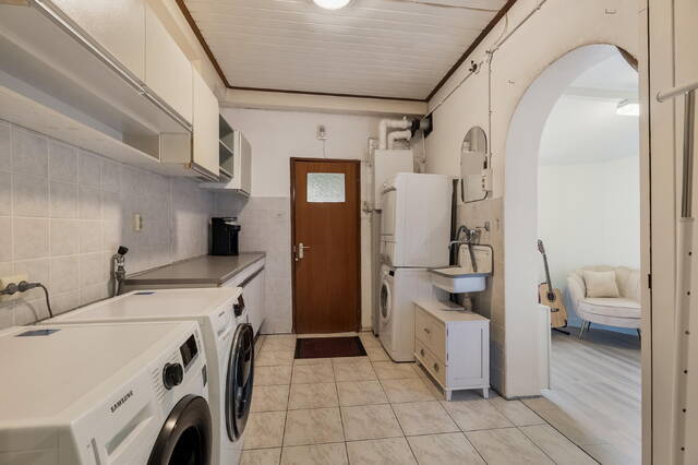 Bijkeuken (ca. 10 m2) met de aansluiting voor de wasmachine en droger, een pantry met een enkele spoelbak met koud/warm waterkraan en de opstelling voor de Cv ketel Intergas bouwjaar 2017. Via een loopdeur zijn de inpandige garage en berging te bereiken.