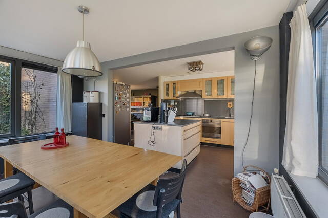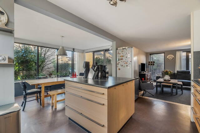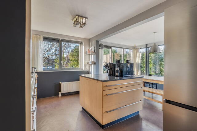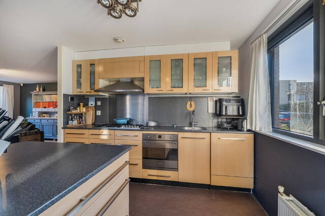 Aan de voorzijde van de woning bevindt zich de open keuken. Wat een toffe plek! Op deze verdieping staat verbinding centraal. Of je nou aan de eettafel zit, staat te koken of lekker op de bank zit, het is allemaal met elkaar verbonden. De keuken is voorzien van een wand met apparatuur en de droom van velen is hier gerealiseerd, een mooi groot eiland! De keuken is voorzien van diverse inbouwapparatuur, met voldoende werk- en kastruimte om hier dagelijks comfortabel te koken. Er is een losse koel- vriescombinatie geplaatst. De eettafel staat in de aanbouw, en dat is gelijk 1 van de tofste plekken van het huis, echt zo'n leefkeuken, open, licht en heerlijk ruimtelijk. Je zit hier lekker de krant te lezen, te dineren met z'n allen of lekker even een paar uurtjes te werken. Waarschijnlijk het populairste plekje van het huis!