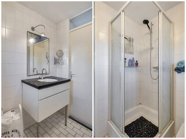 De badkamer is vrij basis, netjes tot het plafond getegeld, voorzien van een douchebak met schuifdeuren, een net wastafelmeubel met stenen blad, mengkraan en spiegel erboven en hier treffen we het tweede toilet.