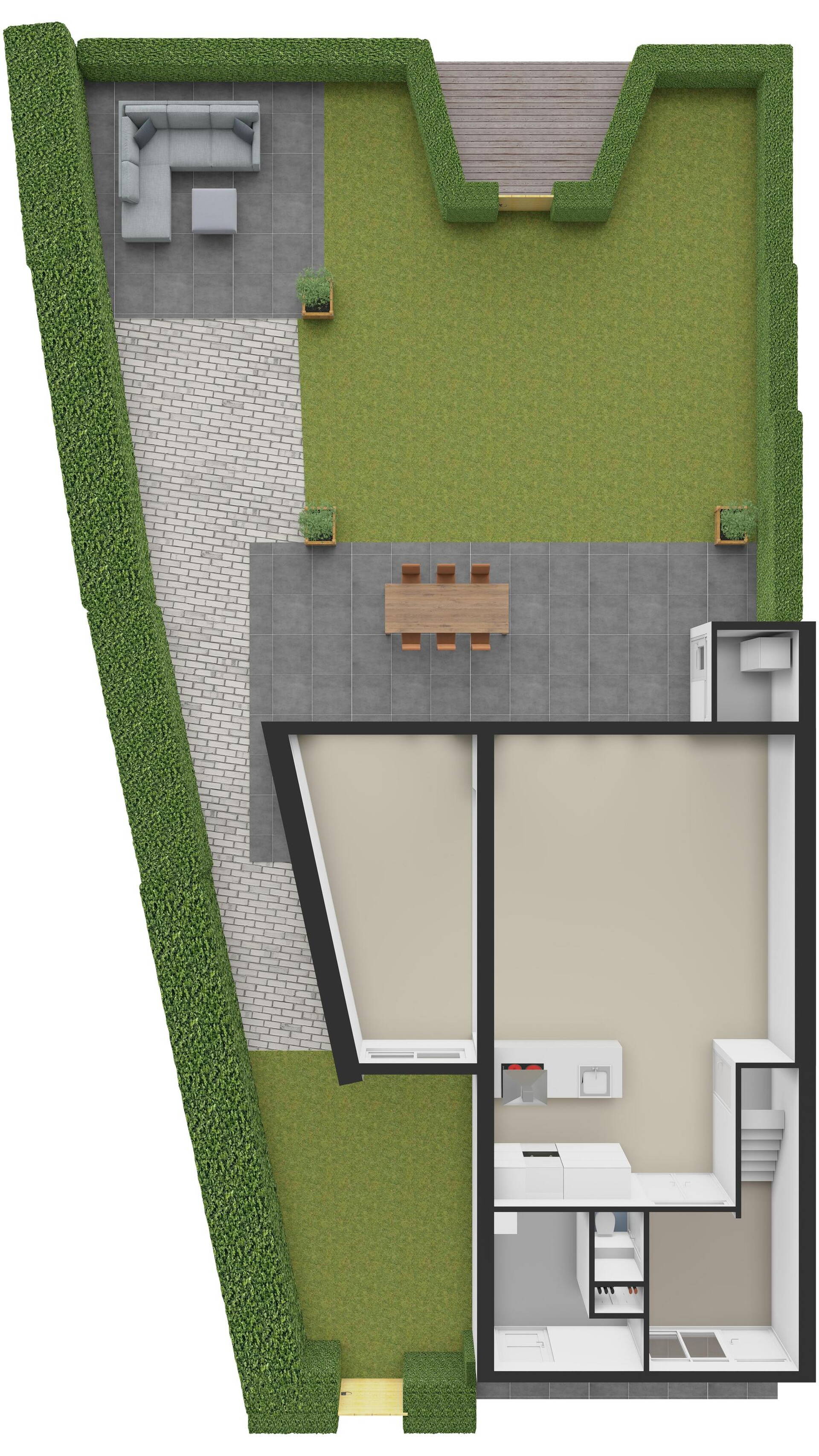De brede en diepe achtertuin op het zuiden is fraai aangelegd met meerdere terrassen en een gazon. Achter in de tuin bevindt zich een trap naar de aan het water gelegen houten vlonder. Hier heeft u directe toegang tot het water en de mogelijkheid om met een bootje de omliggende watertjes en de Gaatkensplas te verkennen. De tuin is bovendien bereikbaar via de zijkant van de woning, wat extra praktisch is.