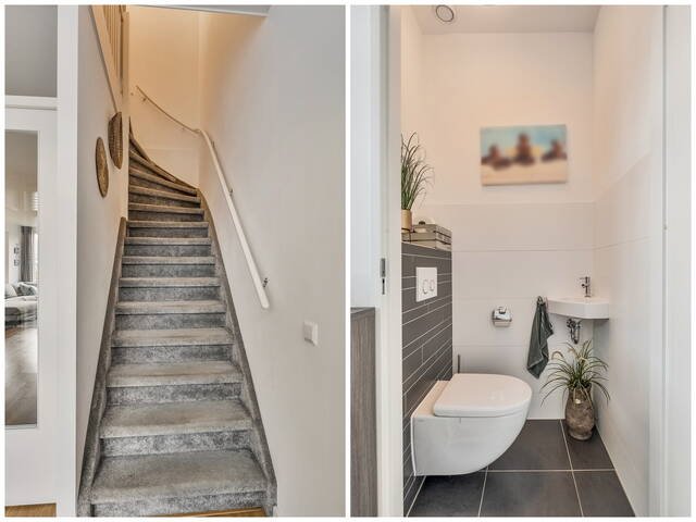 Via de entree komt u in de ruime hal met toegang tot de inpandige berging en de trapopgang naar de eerste verdieping. De toiletruimte is uitgevoerd met een hangend toilet en fonteintje en is gedeeltelijk betegeld in een moderne wit/grijze kleurstelling.