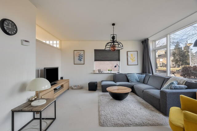 De woonkamer is royaal opgezet en gelegen aan de voorzijde van de woning. Dankzij de vele ramen is dit een bijzonder lichte en aangename leefruimte. De wanden en het plafond zijn strak gestuukt en er is een handig ophangsysteem aanwezig voor lijsten of schilderijen. In 2025 is de vloer geëgaliseerd en voorzien van comfortabele vloerverwarming.