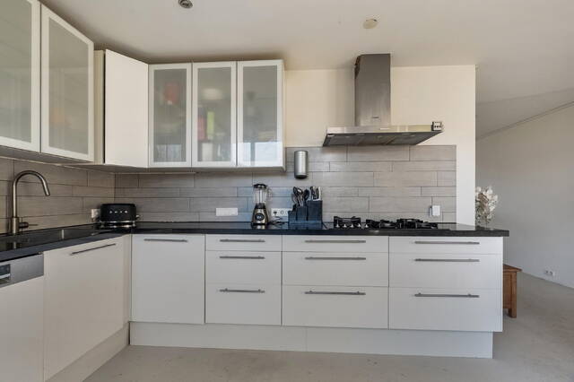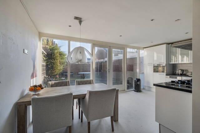Aan de achterzijde bevindt zich de ruime, open woonkeuken in L-opstelling. Deze moderne keuken is uitgevoerd in hoogglans wit en afgewerkt met een composiet aanrechtblad. De keuken is voorzien van diverse inbouwapparatuur, waaronder een koelkast, vrieskast, 5-pits gaskookplaat, extra brede RVS afzuigkap, combimagnetron met heteluchtovenfunctie en een vaatwasser. Verder beschikt de keuken over een grote 1,5 spoelbak, carrouselkast, veel inbouwstopcontacten en geïntegreerde verlichting in de kastjes. Via de openslaande deuren heeft u direct toegang tot de achtertuin, waardoor binnen en buiten naadloos in elkaar overlopen.
