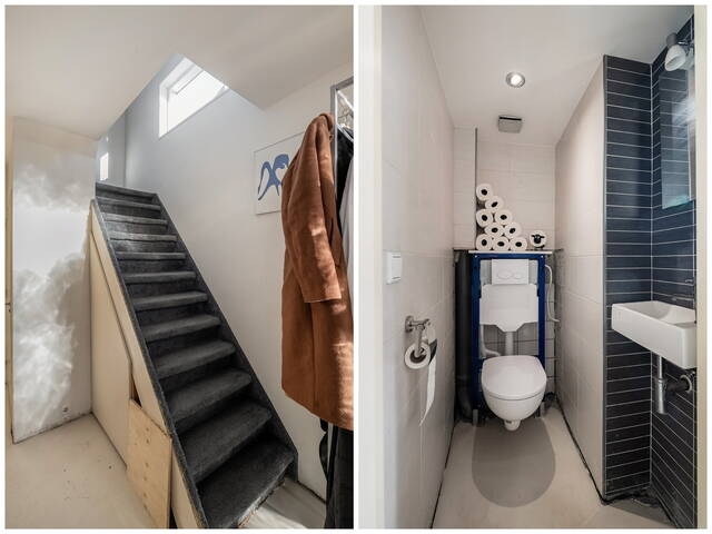 Via de entree komt u in de ruime en lichte hal met een praktische gangkast waarin zich tevens de meters bevinden. De hal biedt veel opbergruimte en toegang tot de trap naar de eerste verdieping. De toiletruimte is in 2025 vernieuwd en voorzien van een hangend toilet, fonteintje, lichte wand- en vloertegels en sfeervolle inbouwverlichting.