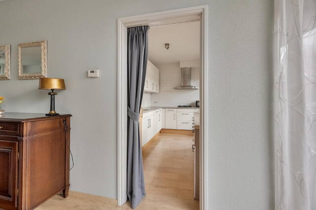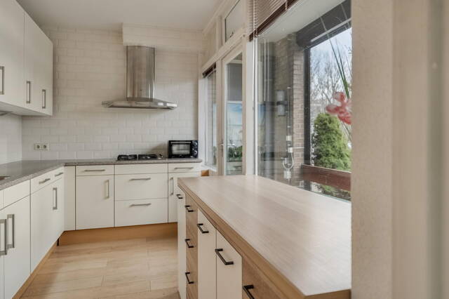 De keuken (ca. 8 m2) is gelegen aan de achterzijde van het complex en is uitgevoerd in een L-opstelling. De keuken is voorzien van diverse inbouwapparatuur zoals een koelkast met vrieslade, 4-pits gaskookplaat, afzuigkap. combimagnetron en een vaatwasser. Verder is de keuken voorzien van een enkele spoelbak en voldoende kastruimte. Het geheel is uitgevoerd in wit en is afgewerkt met een kunststof aanrechtblad, laminaatvloer, deels betegelde wanden en verlichting. Door middel van een balkondeur heeft u toegang tot het zonnige balkon.