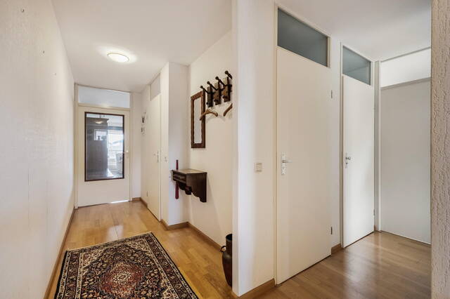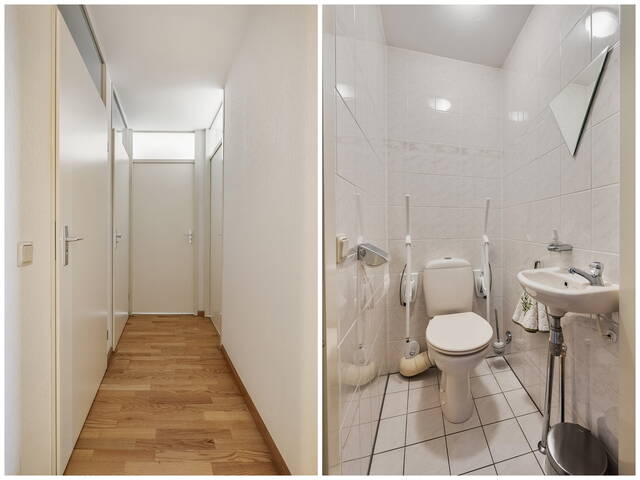 Via de overdekte galerij bereikt u de entree van het appartement. De ruime hal biedt toegang tot alle vertrekken. In de hal bevindt zich een praktische inpandige berging met veel bergruimte en de opstelplaats voor de HR C.V. combiketel (2023) en de mechanische ventilatie-installatie. De toiletruimte is volledig betegeld in een lichte kleurstelling en voorzien van een duoblok en fonteintje.