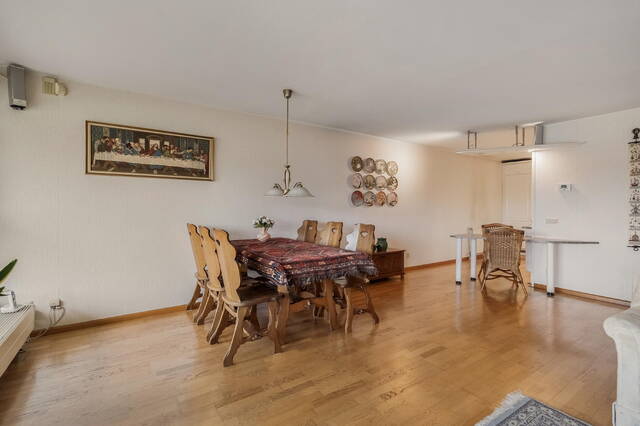 De royale woonkamer is prettig licht dankzij de grote raampartijen en afgewerkt met een parketvloer en behangwanden. Middels een schuifpui is er toegang tot de zonnige serre. Deze ruime serre beschikt over ramen over de gehele breedte, waarvan nagenoeg alle delen geopend kunnen worden, waardoor u hier het hele jaar door comfortabel kunt verblijven. De elektrisch bedienbare zonneschermen zorgen voor verkoeling op de warme dagen.