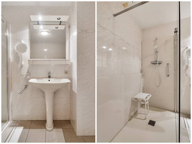 Aan de rustige achterzijde van het complex bevinden zich twee ruime slaapkamers, beide voorzien van vloerbedekking en prettig van formaat. De badkamer is volledig betegeld in een lichte kleurstelling en uitgerust met een vaste wastafel met spiegel en verlichting, een zeer ruime inloopdouche en aansluitingen voor wasmachine en droger.