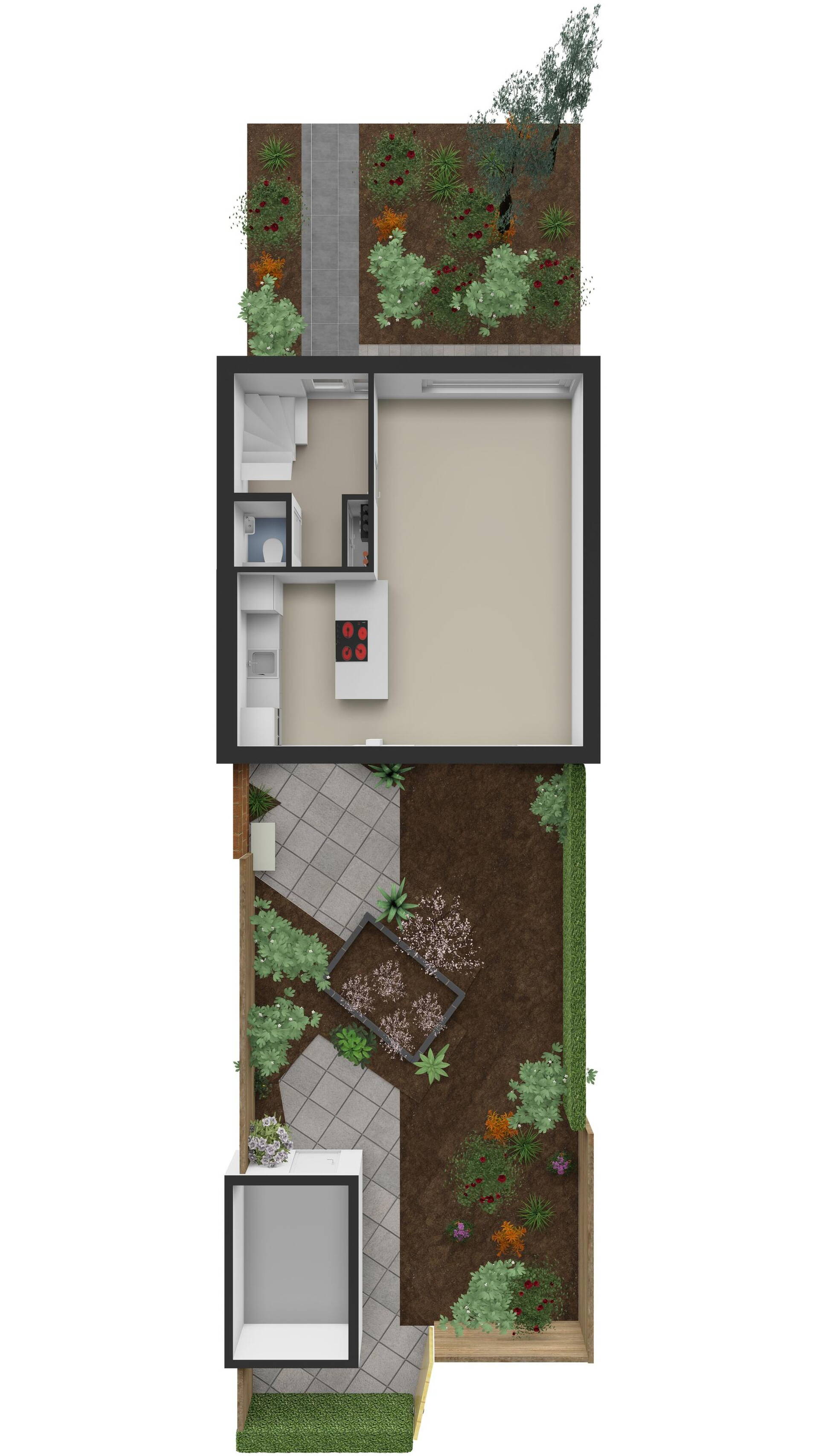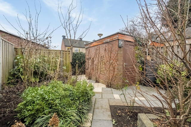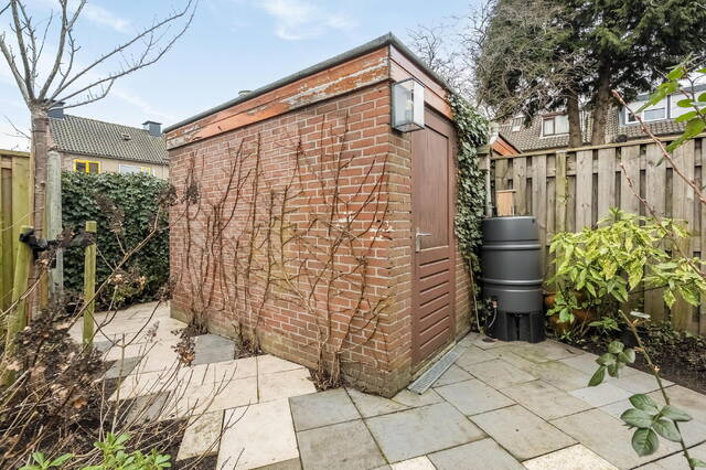 Zodra je de openslaande deuren opent, sta je in de zonnige achtertuin op het zuiden. Hier geniet je vrijwel de hele dag van de zon, terwijl het zonnescherm voor schaduw zorgt wanneer nodig. De tuin is verzorgd aangelegd met sierbeplanting en sierbestrating, heeft een stenen berging en een praktische achterom naar de parkeerplaats. Een heerlijke plek voor lange zomeravonden, spelende kinderen of een gezellige barbecue.