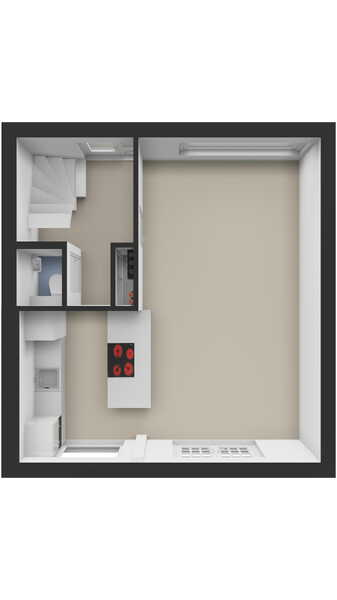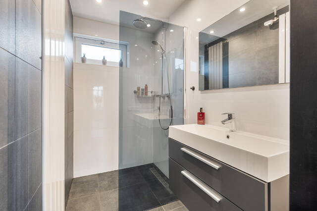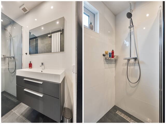 De badkamer aan de voorzijde voelt als een fijne plek om te relaxen. De inloopdouche met rookglazen douchewand en regendouche nodigt uit om de dag ontspannen te beginnen of juist rustig af te sluiten. Het wastafelmeubel met grote spiegel en de inbouwspots in het plafond maken het plaatje compleet. Alles is uitgevoerd in een frisse grijs-witte kleurstelling.