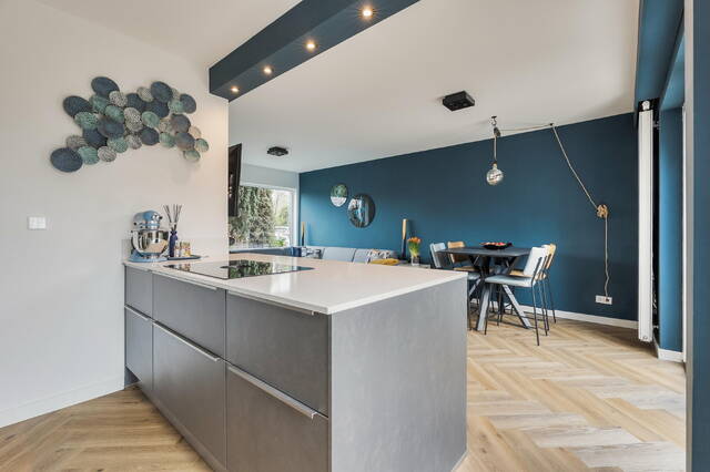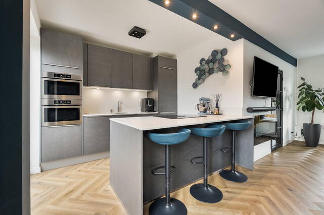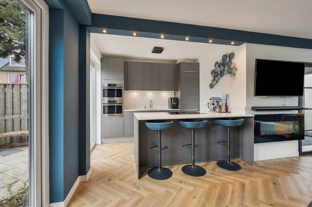 De open keuken (2021) is een echte blikvanger en nodigt uit om samen te koken, borrelen en tafelen. Het kookeiland met Bora kookplaat en eetbar met drie krukken (die gewoon achterblijven) maakt dit dé plek voor ontbijtjes, (t)huiswerkmomenten of een glas wijn terwijl het eten pruttelt. De keuken is compleet uitgerust met onder andere een Quooker, vaatwasser, koel/vriescombinatie en zelfs twee combi-ovens. De grijze fronten in combinatie met het lichte composiet werkblad in marmerlook geven een luxe, tijdloze uitstraling.