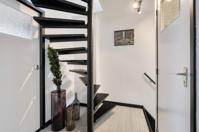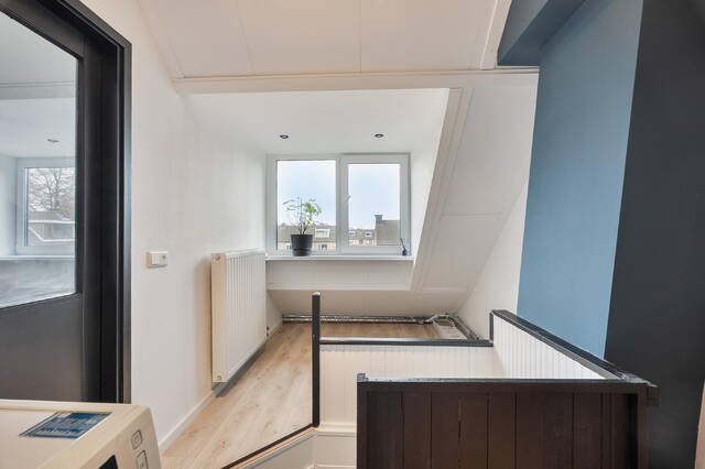 Via de zwarte spiltrap bereik je de tweede verdieping, een verdieping die vaak méér kan dan je denkt. Op de overloop zorgt de dakkapel aan de achterzijde voor extra licht en ruimte. Hier vind je de cv-opstelling en de aansluiting voor wasmachine en droger; de wasmachine blijft zelfs achter.