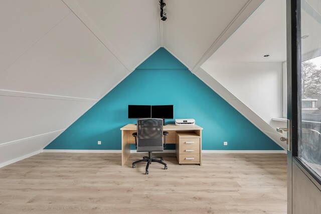 Slaapkamer 4 is een volwaardige kamer met dakkapel en spotjes in het plafond. Een ideale tienerkamer, logeerkamer of juist die lang gewenste thuiswerkplek waar je ongestoord kunt werken. Ook hier zijn de wanden en plafonds glad gestuct en ligt er een laminaatvloer, helemaal in lijn met de rest van de woning.