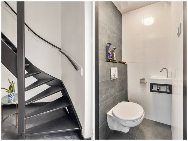 Je komt binnen in de hal, waar meteen de verzorgde afwerking opvalt. Hier vind je de meterkast, de toiletruimte en de trap naar boven. Het toilet is strak en modern uitgevoerd met een hangend toilet en fonteintje, volledig betegeld in een stijlvolle grijs-witte kleurstelling die je later ook in de badkamer terugziet.