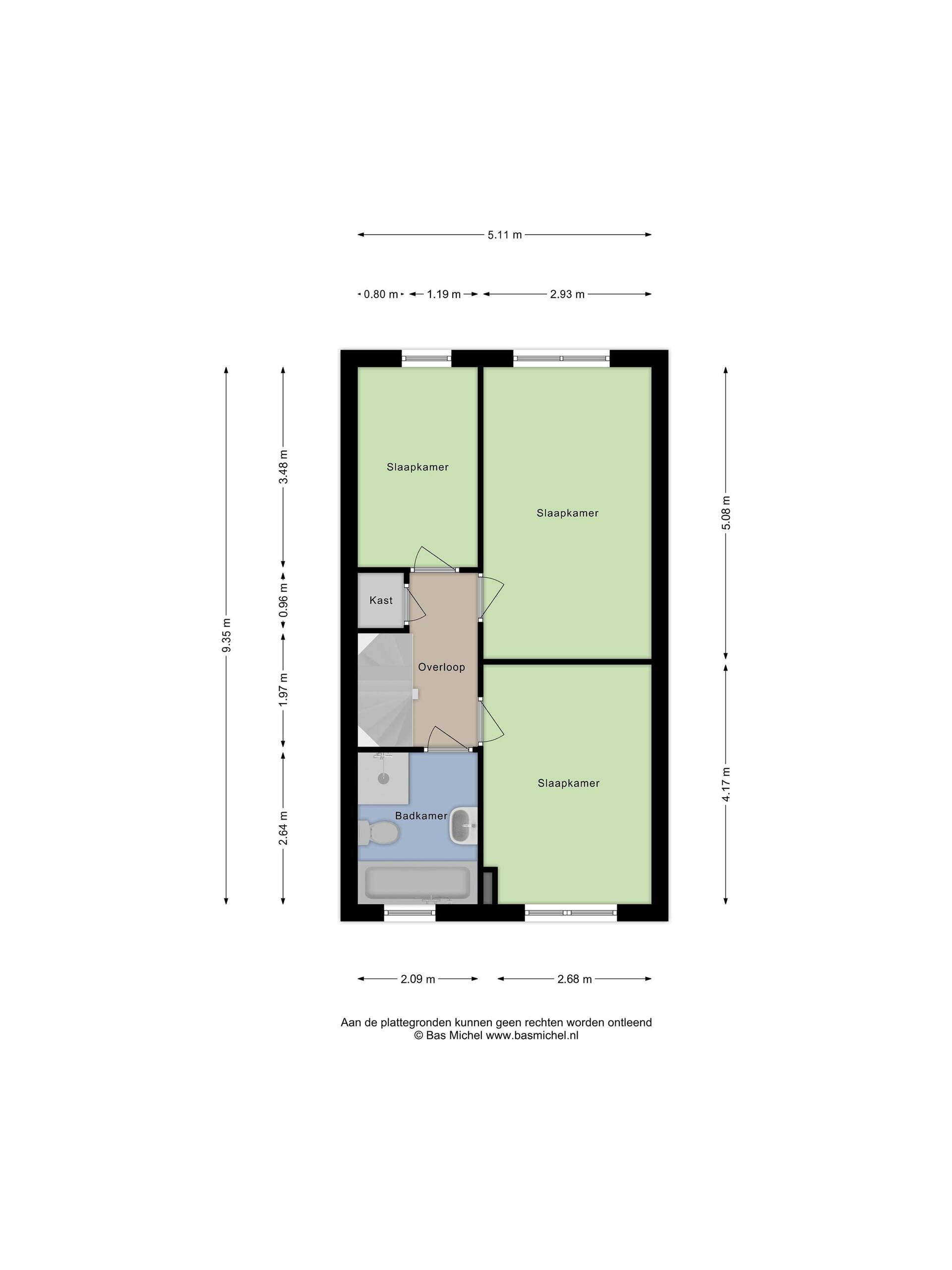 Overloop met toegang tot drie slaapkamers, de badkamer en een ruime bergkast. Aan de achterzijde bevinden zich twee slaapkamers en aan de voorzijde één slaapkamer. Alle kamers zijn afgewerkt met behang en vloerbedekking.