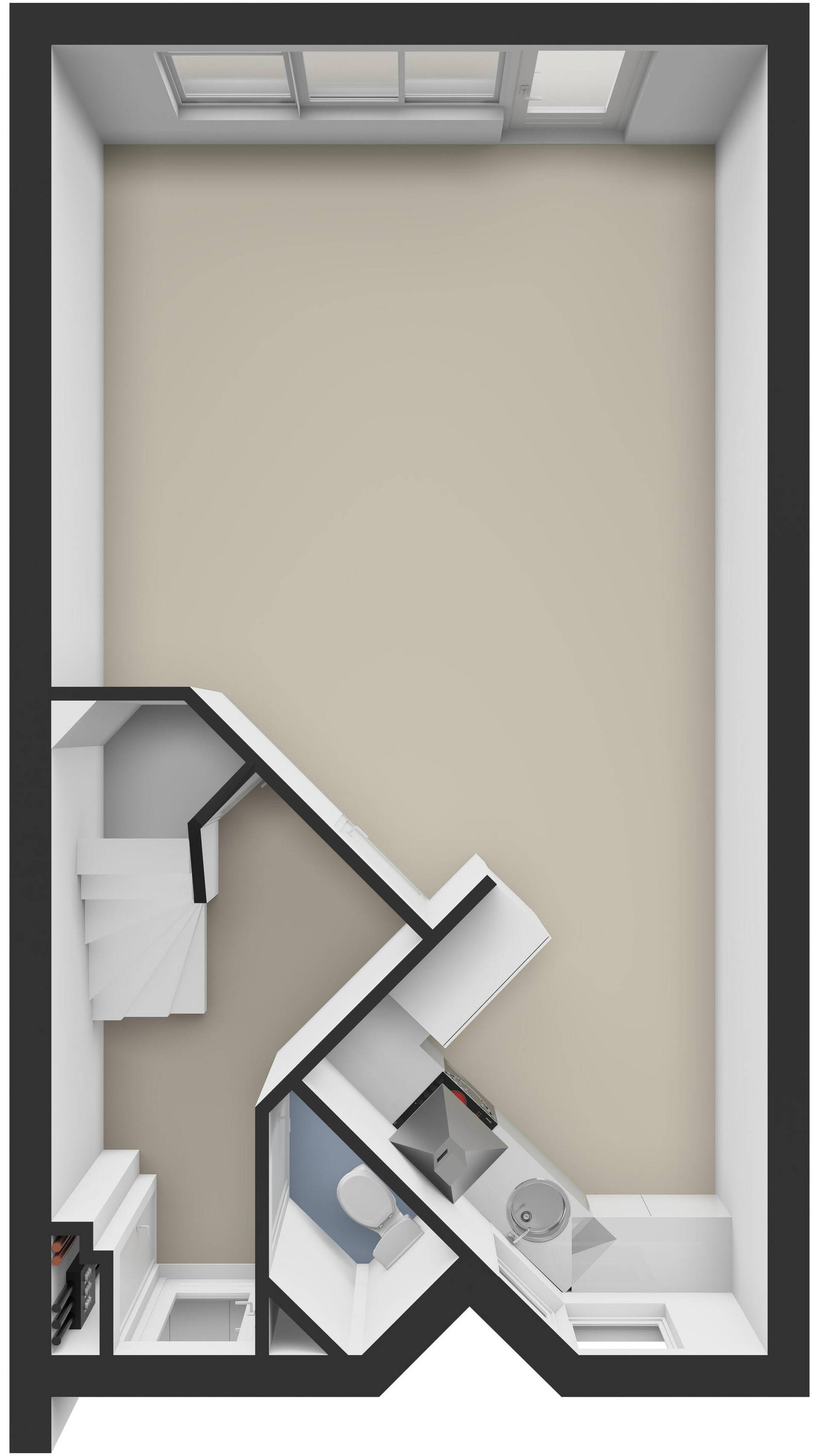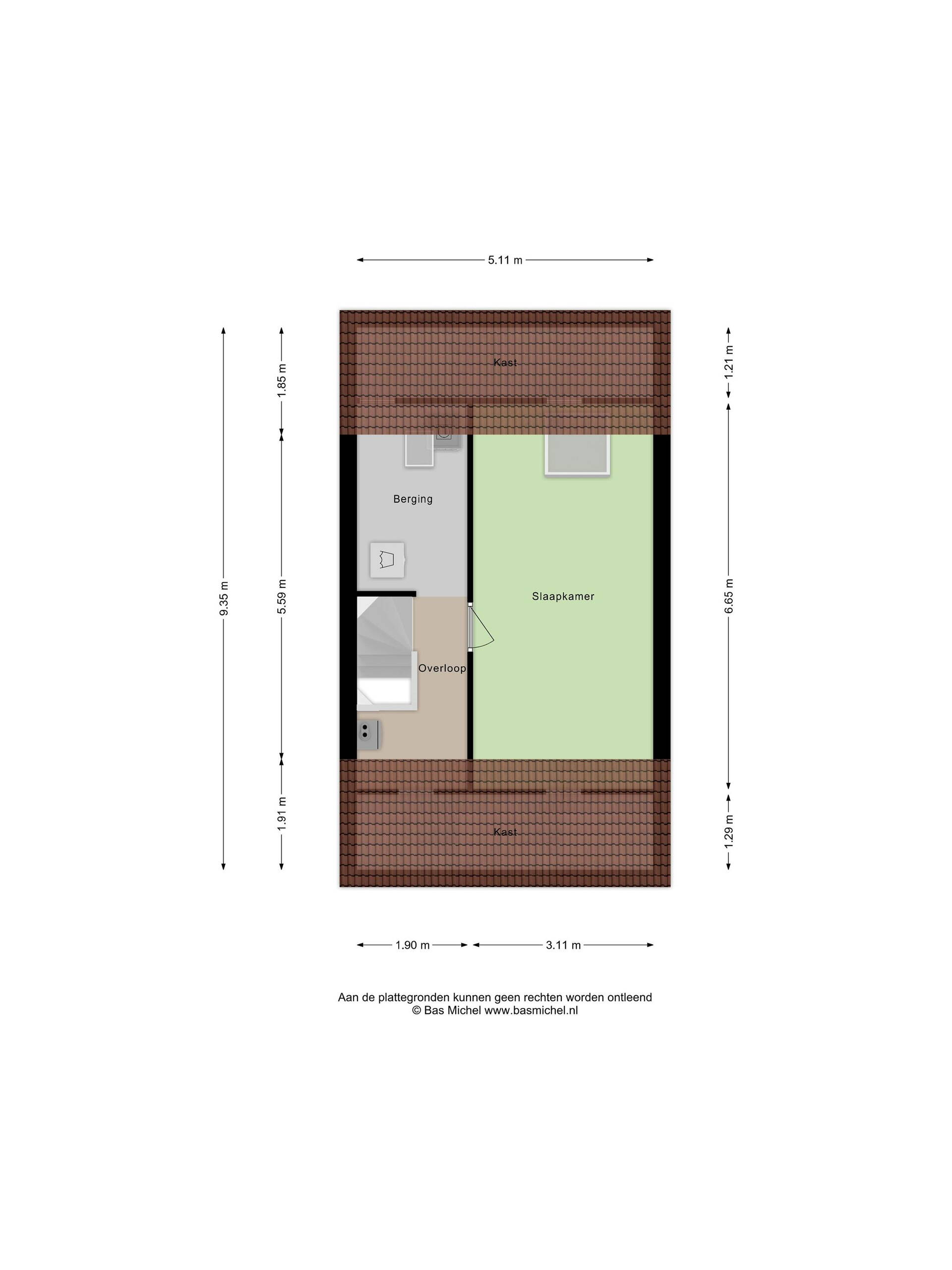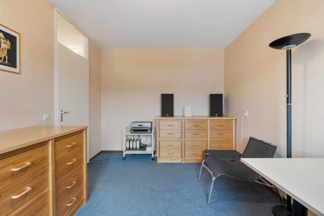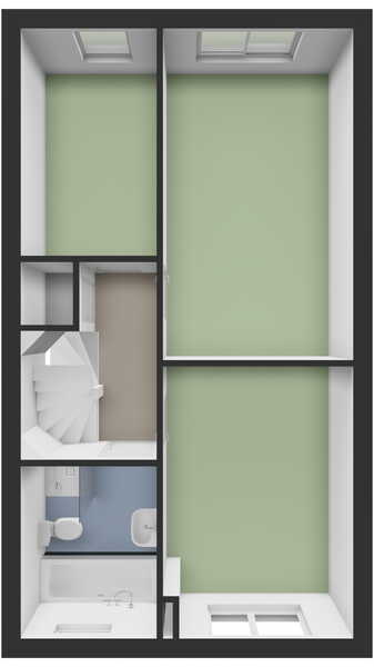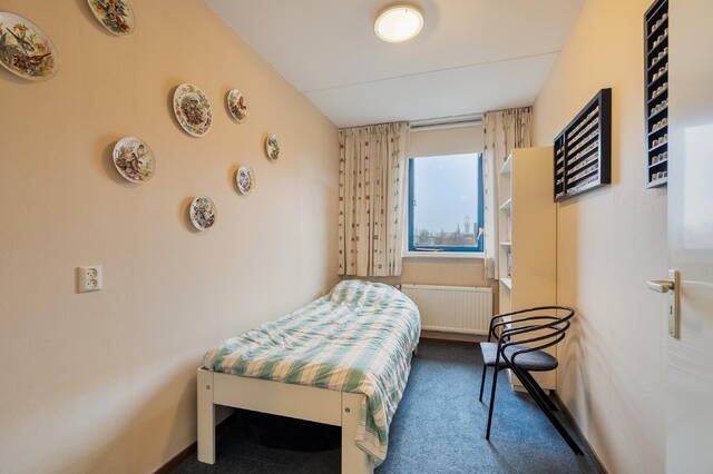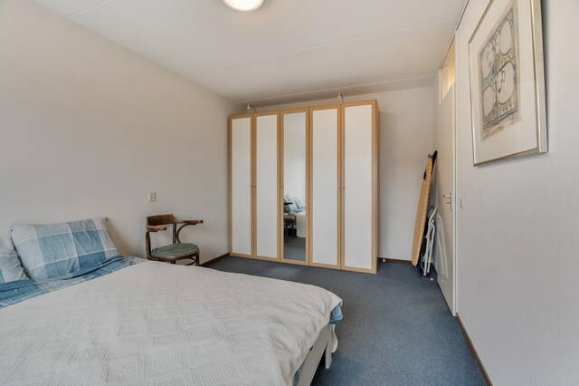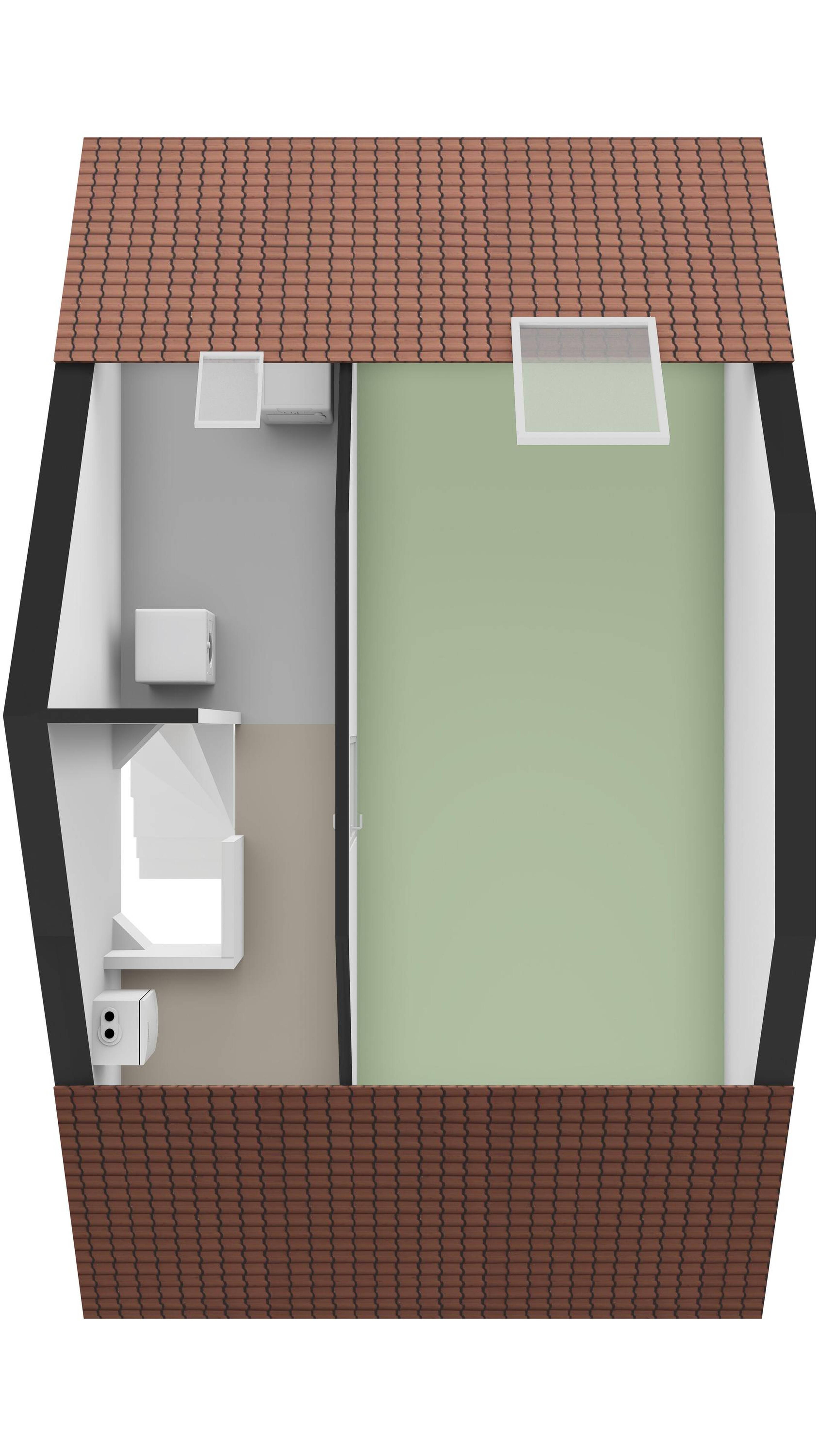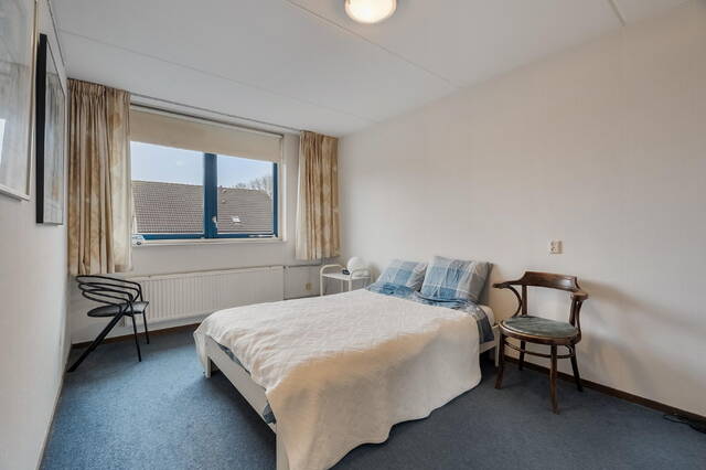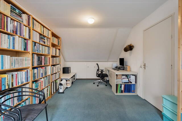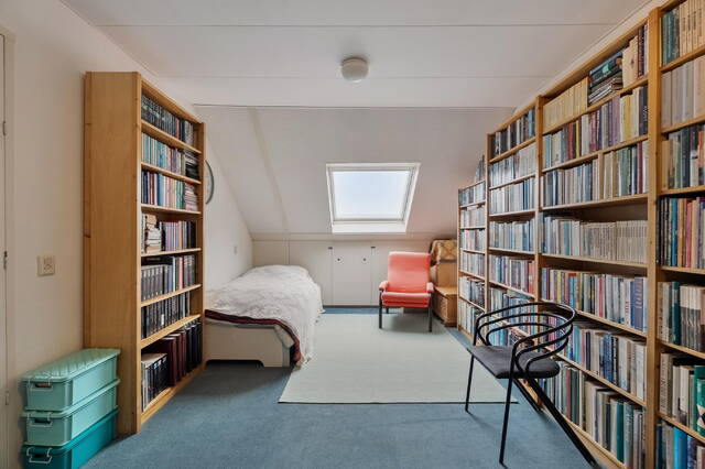 Op deze verdieping bevindt zich de vierde slaapkamer, eveneens voorzien van een dakraam aan de achterzijde. Over de gehele verdieping zijn knieschotten aanwezig, wat zorgt voor veel praktische bergruimte. De vloer is voorzien van vloerbedekking.