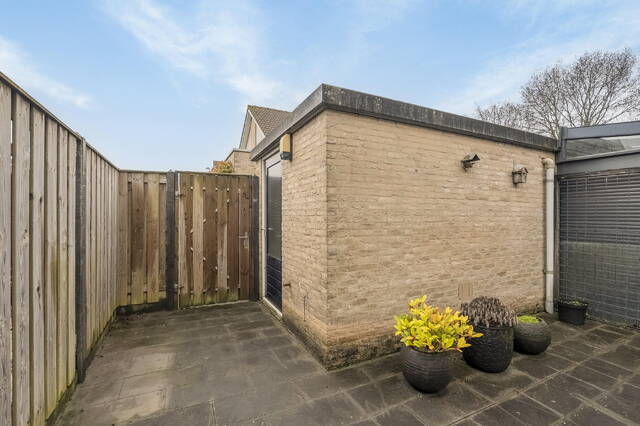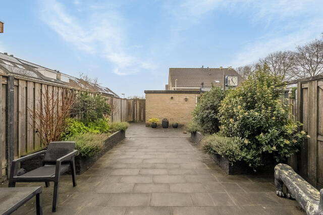 Vanuit de woonkamer is de achtertuin bereikbaar. De tuin ligt gunstig op het zuiden, is volledig bestraat en ingericht met grote vaste plantenbakken. Daarnaast is er een handmatig bedienbaar zonnescherm aanwezig. De tuin is omsloten door houten schuttingen en beschikt over een stenen berging achterin de tuin. Via de achterom is de tuin ook van buitenaf bereikbaar.