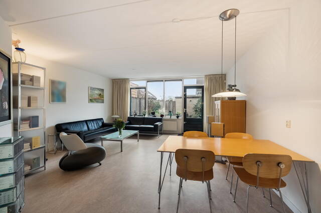 De woonkamer is heerlijk licht dankzij de grote raampartij aan de achterzijde en beschikt over een loopdeur naar de achtertuin. De vloer is afgewerkt met linoleum en de wanden met glasvliesbehang. De aanwezigheid van vloerverwarming zorgt voor extra comfort.