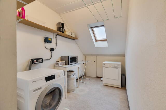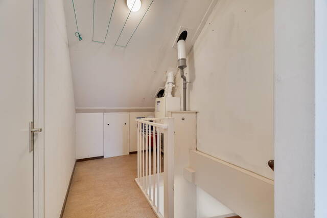 Via een vaste trap bereik je de tweede verdieping. Op de voorzolder bevinden zich de opstelling voor de wasmachine en droger, de cv-installatie, de mechanische ventilatie en de omvormer voor de zonnepanelen. Aan de achterzijde zorgt een Velux dakraam voor prettig daglicht. De vloer van de voorzolder is afgewerkt met linoleum.