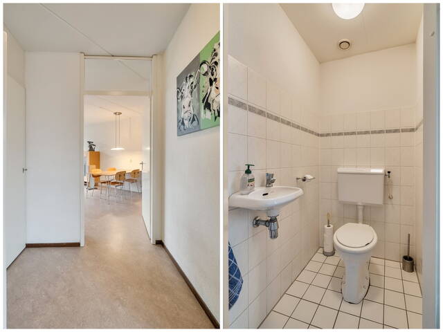Entree in de hal met meterkast, trapkast en de toiletruimte. Het toilet is voorzien van een duoblok toilet en een fonteintje en is gedeeltelijk betegeld in een lichte kleurstelling. Vanuit de hal leidt de trap naar de eerste verdieping.
