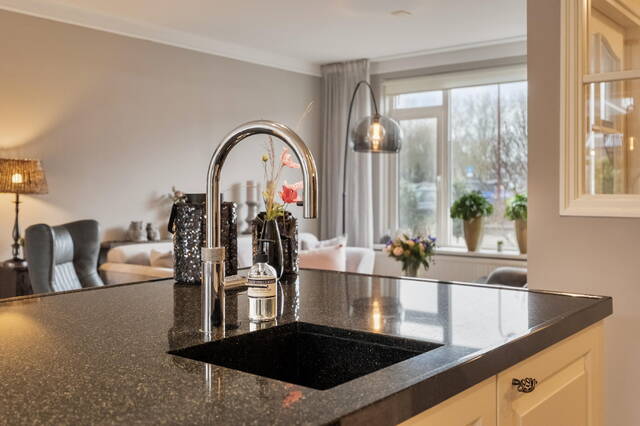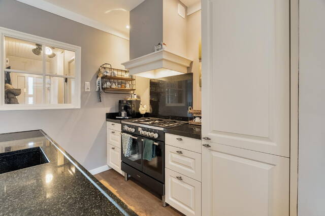 De achterzijde is feitelijk een hele mooie grote leefkeuken! Wat een topruimte en wat is dit slim en ruimtelijk ingedeeld. Tegen de zijwand zijn het grote fornuis met 2 ovens en 5-pits gasstel geplaatst met een grote afzuigkap erboven. Daar treffen we ook de koelkast en vriezer en 6 laden om wat spullen in op te bergen. Er is een mooi plekje voor je koffiemachine. Dan treffen we het prachtige eiland van ca. 120 x 180 cm. Wat top, want dat betekent aan beide kanten diepe kasten! Op de kastjes ligt een mooi granieten keukenblad met daarin de RVS spoelbak met Quooker. Een heerlijk groot werkblad om mooie maaltijden op te bereiden. Hieronder is ook de vaatwasmachine verwerkt.