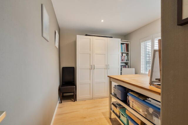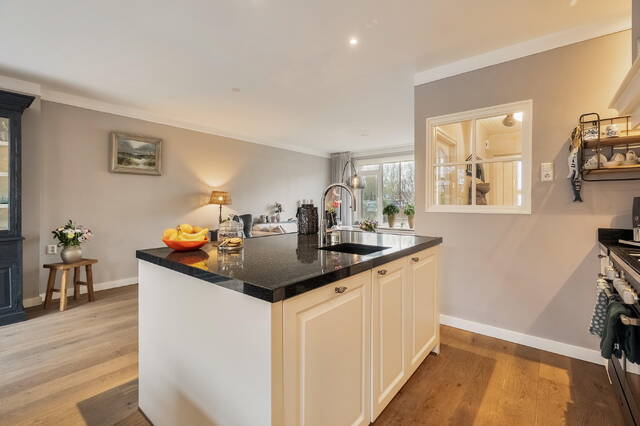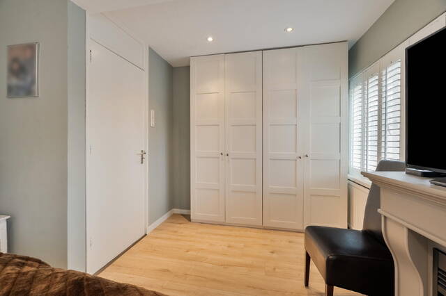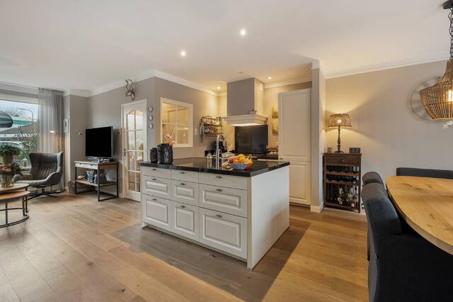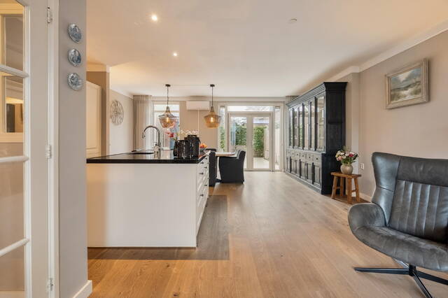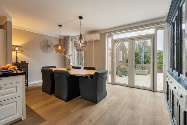 Aansluitend ga je lekker in de uitbouw aan de eettafel zitten. Een plek om heerlijk te tafelen, maar ook een hele fijne plek om de krant te lezen, wat spelletjes te doen en nog even wat mailtjes weg te werken. Er is ruimte voor een grote servieskast en er is zelfs nog ruimte voor een toffe speelhoek voor kids. Op de vloer ligt een mooie houten vloer en de muren en plafond zijn strak gestuukt. Bovendien is de woning voorzien van een airconditioning, waardoor het ook op warme zomerdagen heerlijk koel blijft in huis.