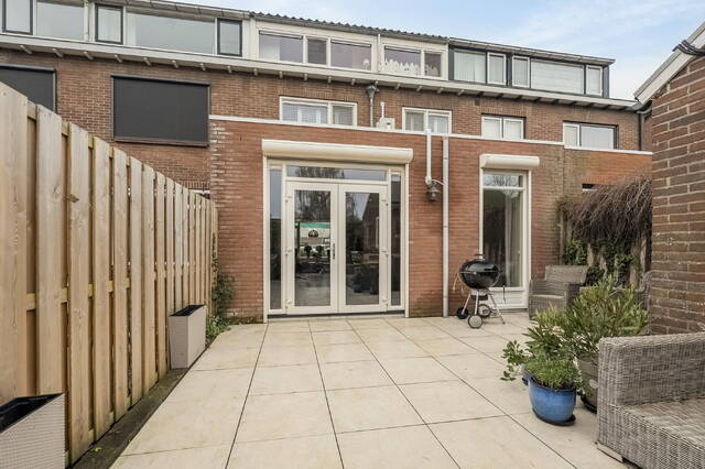 Door de dubbele openslaande deuren lopen we de achtertuin in, deze ligt op het oosten en is circa 44 m² groot. Hier geniet je van de ochtend- en de middagzon. De tuin is verzorgd aangelegd en beschikt over een stenen berging en een achterom. Op de schuur liggen 4 zonnepanelen. De voorzijde van de woonkamer ligt op het westen, vandaar dat er een mooie luifel is geplaatst om de zon in de zomer een beetje buiten te houden.