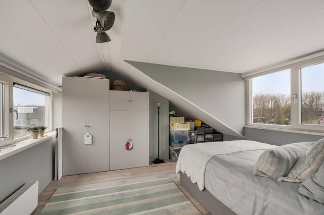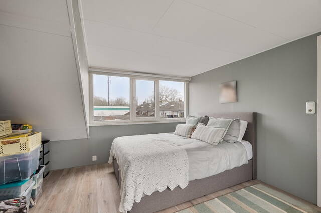 Op de tweede verdieping is de nokverhoging toegepast en dat is een gamechanger. Daardoor is er een volwaardige verdieping ontstaan met een overloop waar je de wasmachine en droger plaatst en is de CV ketel opgesteld en is er wat bergruimte. Daarnaast treffen we hier de derde slaapkamer met dakkapel. Wat een heerlijk ruime kamer! Ruimte voor een groot bed een bureau en wat kastruimte, wat wil je nog meer, dat is de droom van ieder kind, tenzij je voor jezelf ruimte zoekt om lekker thuis te werken, want ook daarvoor is dit de perfecte ruimte.