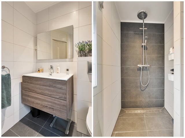 De badkamer is erg netjes en bewijst maar dat een badkamer niet riant hoeft te zijn om wel heel ruim aan te voelen. De juiste indeling is de sleutel. In deze badkamer treffen we een grote douche met mooie glazen deur, een grote wastafel met wastafelmeubel en spiegel erboven en we treffen hier het tweede toilet. Het raam zorgt hier voor een prettige lichtinval!