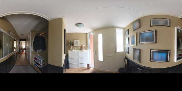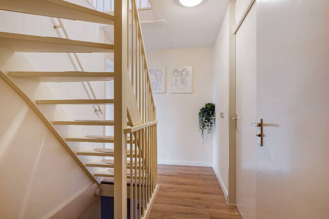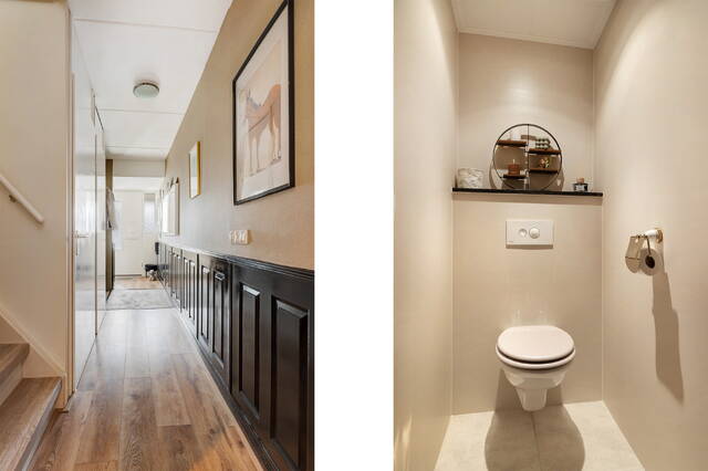 Een ruime, lichte entree verwelkomt u direct. De hal is voorzien van garderoberuimte, meterkast en een modern afgewerkte toiletruimte met stijlvolle lichte wandpanelen.