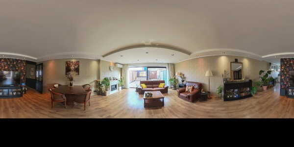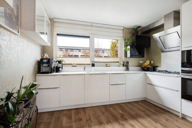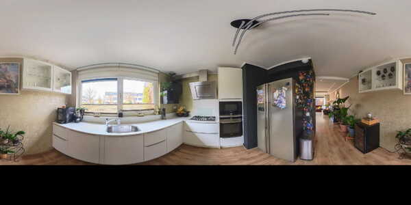 De moderne halfopen keuken aan de voorzijde is strak uitgevoerd in hoekopstelling met uitgebreide inbouwapparatuur zoals een 5-pits gaskookplaat met RVS afzuigkap, oven, magnetron, vaatwasser en een royale Amerikaanse koel-vriescombinatie. Deze laatste is zelfs verrijdbaar, waardoor de praktische trapkast altijd eenvoudig bereikbaar blijft.