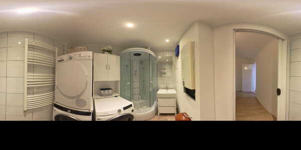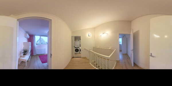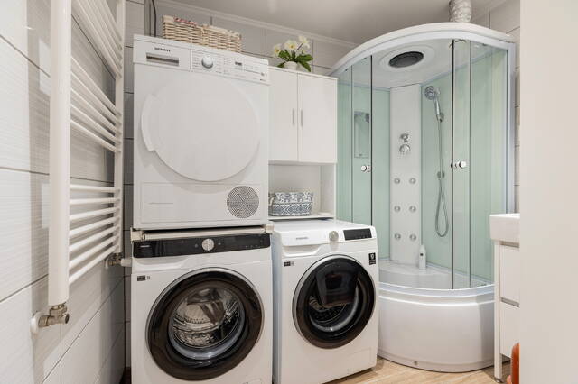 Op de overloop bevindt zich een afgesloten technische ruimte met opstelplaats voor de wasmachine en droger, de CV-installatie, een extra douchecabine met massagejets en een wastafelmeubel – ideaal voor een groot gezin.