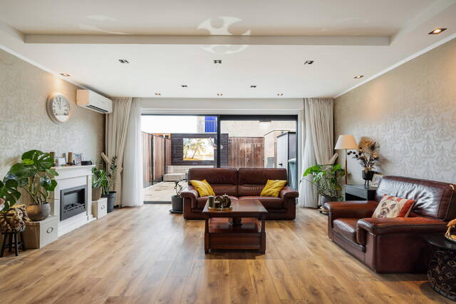 Via de zwarte glazen paneeldeur bereikt u de tuingerichte woonkamer – uitgebouwd, voorzien van grote schuifpui, waardoor daglicht rijkelijk naar binnen stroomt. De laminaatvloer met vloerverwarming zijn nieuw aangelegd in 2021. De spotverlichting in het plafond, convectorradiator en een sfeervolle elektrische haard zorgen voor sfeer én comfort. Daarnaast is er airconditioning (2020) aanwezig voor zowel koeling als verwarming.