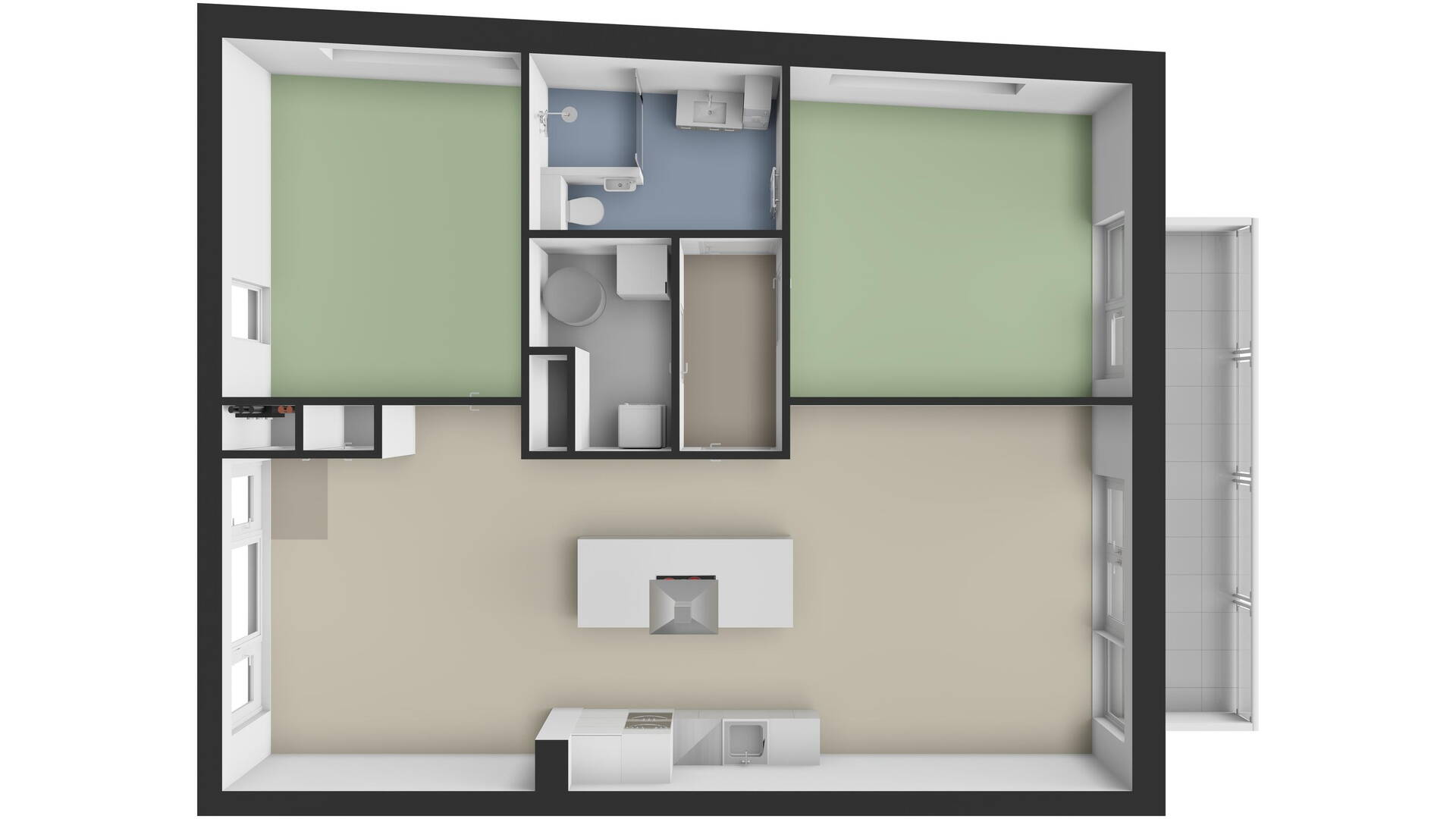 Slaapkamer 1 is bereikbaar vanuit het eetgedeelte en is ideaal als hoofdslaapkamer. Slaapkamer 2 is toegankelijk vanuit de hal, grenst aan de keuken en beschikt over een deur naar het terras – perfect als logeer-, werk- of hobbykamer.