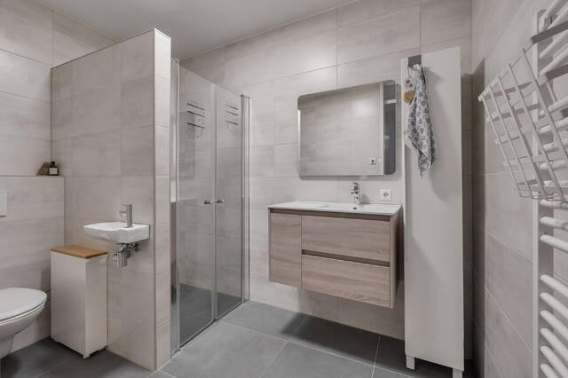 De badkamer is modern en volledig betegeld in een stijlvolle beige-grijze kleurstelling. Voorzien van een ruime inloopdouche met glazen deuren, een wastafelmeubel met spiegel voorzien van verlichting en verwarming, een hangend toilet en een elektrische radiator.