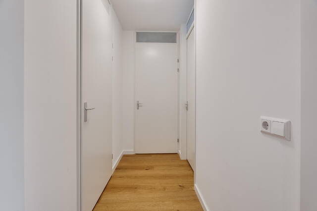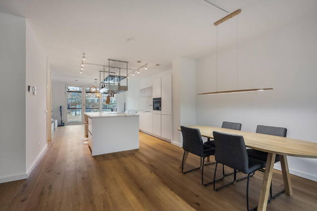 Bij binnenkomst van het appartement stapt u direct in de eetkamer, die in open verbinding staat met de centraal gelegen keuken en de woonkamer. De gehele woning is afgewerkt met een moderne pvc-vloer met comfortabele vloerverwarming en strak gestucte wanden en plafonds.