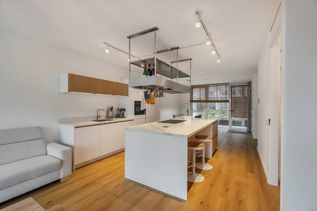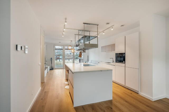 De keuken vormt het hart van het appartement en is uitgevoerd in een stijlvolle witte kleurstelling met een licht marmerkleurig keramisch werkblad. Het kookeiland met twee zitplaatsen nodigt uit tot gezellig tafelen of borrelen. De keuken is compleet uitgerust met een combi-oven, koel-/vriescombinatie, vaatwasser en een 5-pits inductiekookplaat met RVS design afzuigkap en extra bergruimte.