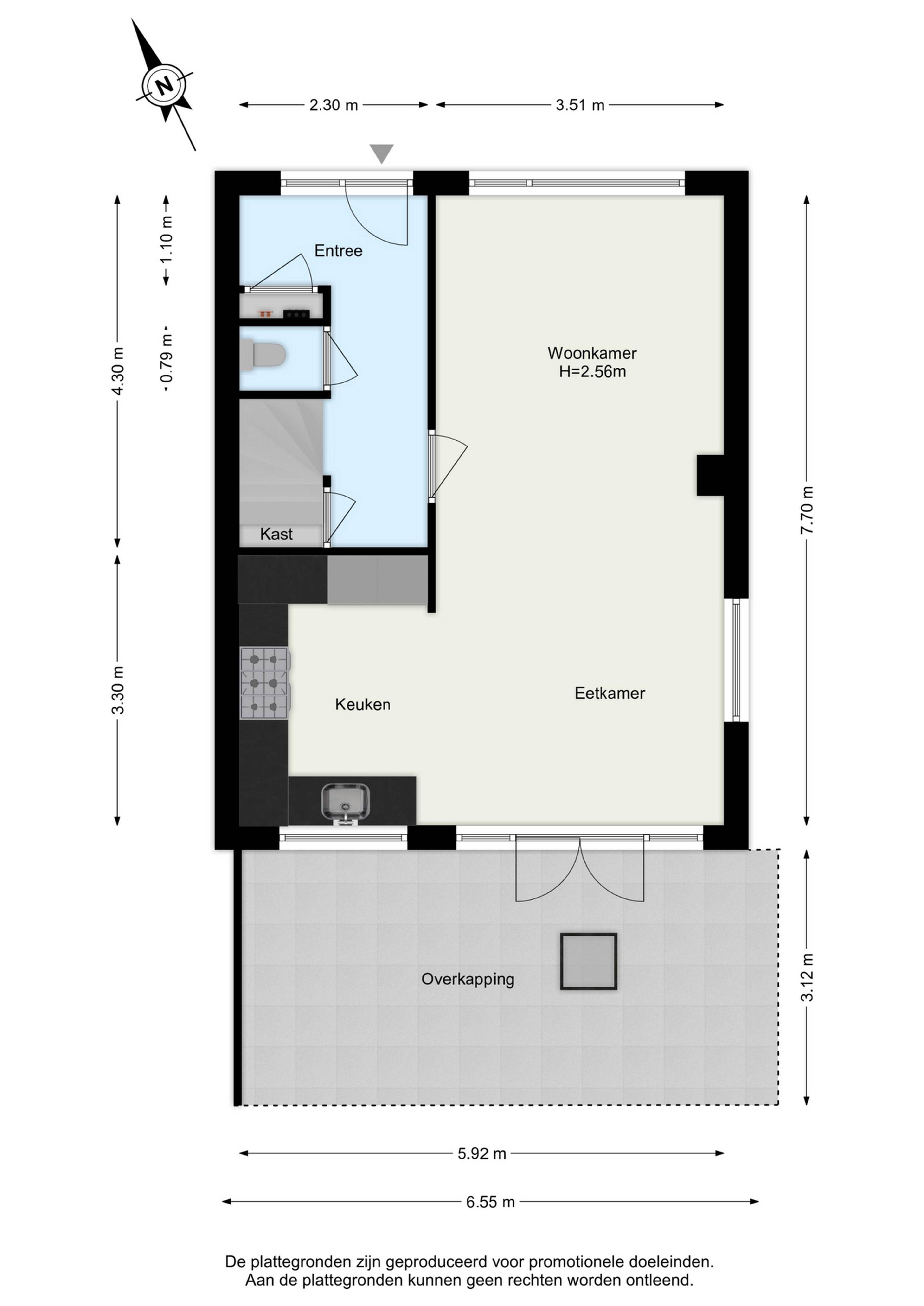 Vanuit de hal zijn de meterkast, de trapkast en het toilet bereikbaar. De hal biedt daarnaast toegang tot het woongedeelte en de trap naar de eerste verdieping.