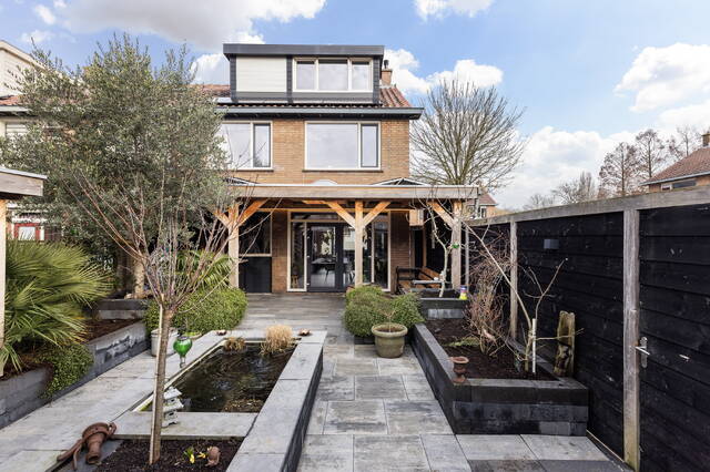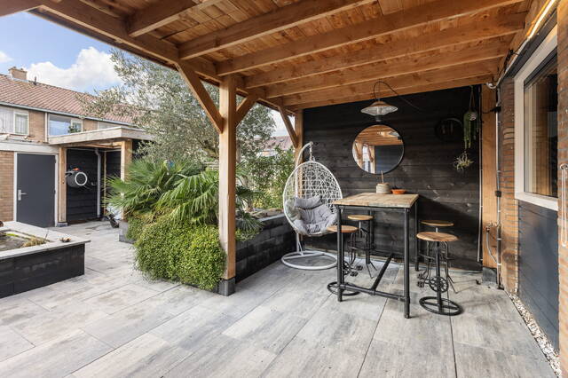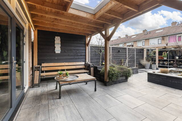 De achtertuin is verzorgd, stijlvol aangelegd en vormt een verlengstuk van het wooncomfort binnen. De tuin is gelegen op het zuidwesten, waardoor u hier tot in de avond van de zon kunt genieten. De tuin is grotendeels bestraat met dezelfde tegels als in de voortuin, wat zorgt voor een rustig en samenhangend geheel. Door de slimme indeling is er volop ruimte om op verschillende momenten van de dag van buiten te genieten.