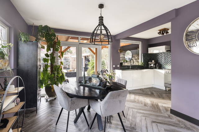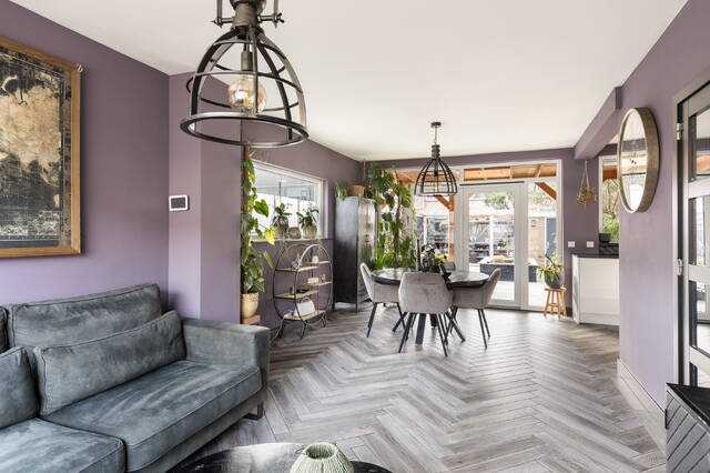De woonkamer is heerlijk licht dankzij de grote raampartijen en het extra zijraam, wat kenmerkend is voor deze hoekwoning. Het daglicht zorgt voor een open en prettige sfeer en er is volop ruimte voor een comfortabele zithoek en een royale eethoek.