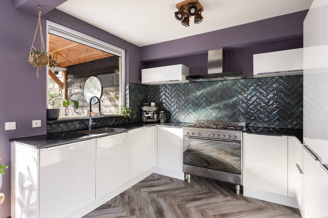 De open keuken sluit naadloos aan op de woonkamer en is modern uitgevoerd. De keuken beschikt over witte kasten, een zwart aanrechtblad en een achterwand met een visgraatmotief, wat het geheel een stijlvolle uitstraling geeft. De keuken is voorzien van diverse apparatuur, waaronder een vaatwasser, koelkast, vriezer en afzuigkap. Daarnaast is er een vrijstaand 5-pits gasfornuis met oven aanwezig. Er is voldoende opbergruimte voor keukengerei en voorraad. Een groot raam in de keuken biedt prettig uitzicht over de tuin en zorgt ook hier voor veel natuurlijk licht.