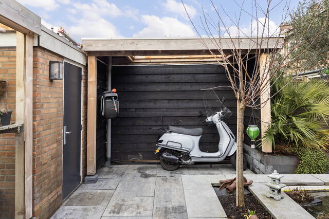Achterin de tuin zijn meerdere praktische voorzieningen aanwezig. Zo is er een overkapping voor het stallen van fietsen of een scooter, een aparte overkapping voor het neerzetten van spullen en daarnaast een stenen berging voor extra opslagruimte. De tuin is rondom afgewerkt met een antracietkleurige schutting, voorzien van sfeerverlichting. Via een deur in de schutting is er een directe uitgang naar de straatzijde, wat extra gemak biedt.