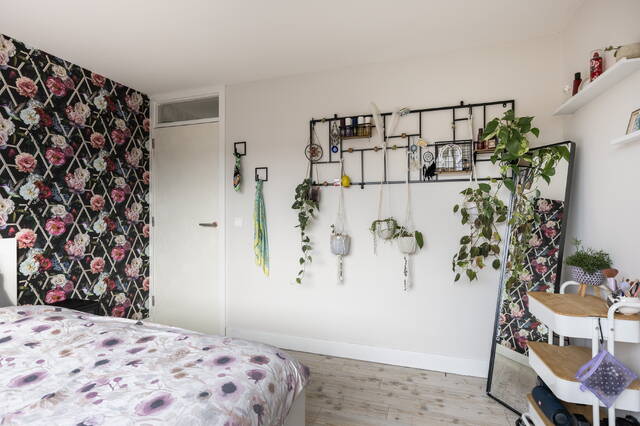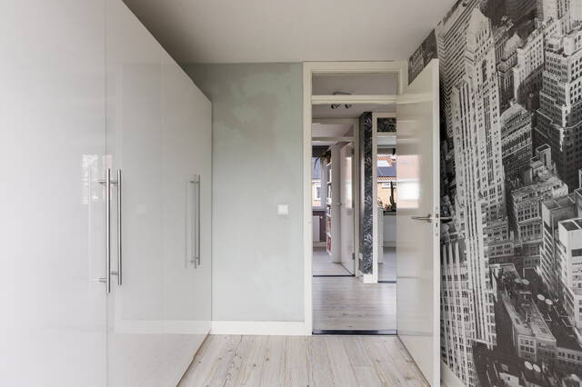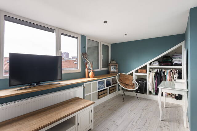 De ruimte is slim en speels ingedeeld, waarbij optimaal gebruik is gemaakt van de schuine kap en de holle ruimtes. Zo is er een maatwerk kastenwand gerealiseerd, waardoor de beschikbare ruimte efficiënt wordt benut en er veel opbergruimte aanwezig is zonder dat dit ten koste gaat van de leefruimte. De dakkapel is voorzien van rolluiken, wat bijdraagt aan comfort en privacy.