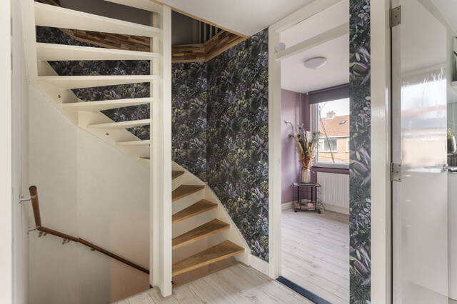 De trap naar de eerste verdieping is bereikbaar vanuit de hal en vormt een praktische en overzichtelijke verbinding met de slaapverdiepingen.